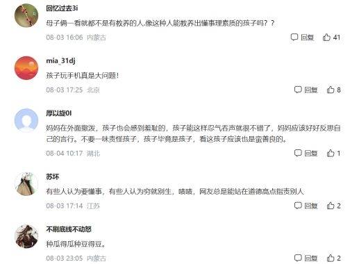 在路人的劝解下,男孩妈妈起来自己走了,男孩在原地仍悻悻不已。