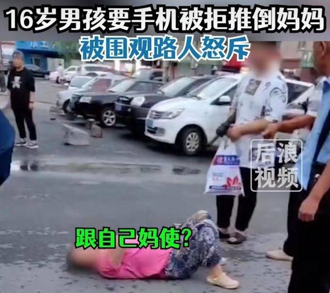 在黑龙江哈尔滨,一名16岁的男孩当街将他的母亲推倒在地,引众人围观。