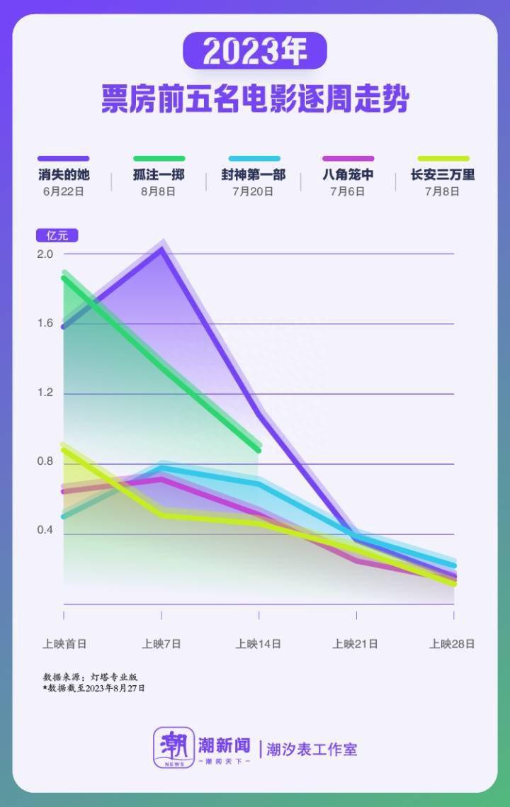 今年暑期档,国产片表现尤其亮眼,截至发稿前,已有4部电影票房超过20亿元,分别是《消失的她》《孤注一掷》《八角笼中》和《封神第一部》,紧随其后的第五名《长安三万里》票房也超过17亿元,5部电影合计票房约占暑期档总票房的2/3。