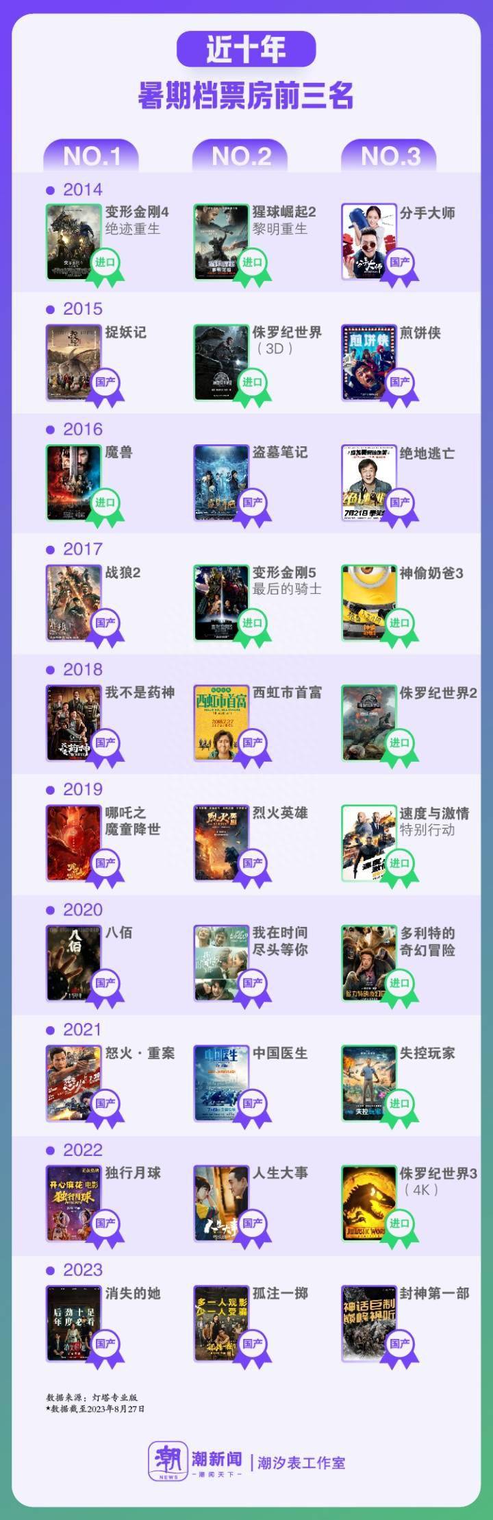 记者梳理过去十年间暑期档票房排名发现,2014年至2022年间,每年暑期档都有一部进口片位列前三,其中不乏“变形金刚”“侏罗纪世界”等超级IP。但2018年开始,进口片往往只能排在当年暑期档的第三名,直至今年,暑期档票房的前六位均被国产佳作占据,好莱坞大片却整体低迷,单片均未取得出彩的票房成绩。