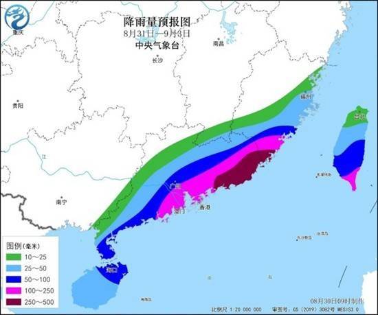 福建的风雨影响将主要集中在今天至9月2日,南部地区雨势较强,漳州、厦门、龙岩、泉州或遭遇暴雨到大暴雨,累积雨量普遍有100到200毫米,局部可达350毫米。