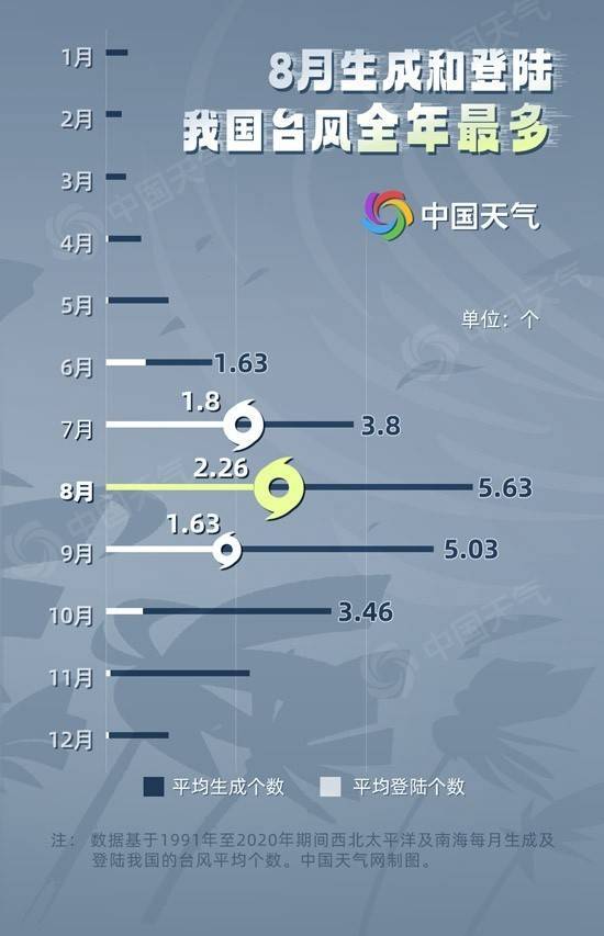 近期,台风一个接一个扎堆来袭,目前西北太平洋上还维持三台共舞的局面。从常年数据来看,8月是一年中台风生成和登陆我国最多的月份,平均有5.63个台风生成,2.26个台风登陆我国。9月也是台风高发期,此时生成的台风被称为秋台风,常年生成个数仅次于8月。许映龙介绍,今年西北太平洋的秋台风活动仍将比较活跃,将生成5个左右,其中有两个将影响我国,较常年同期偏多。